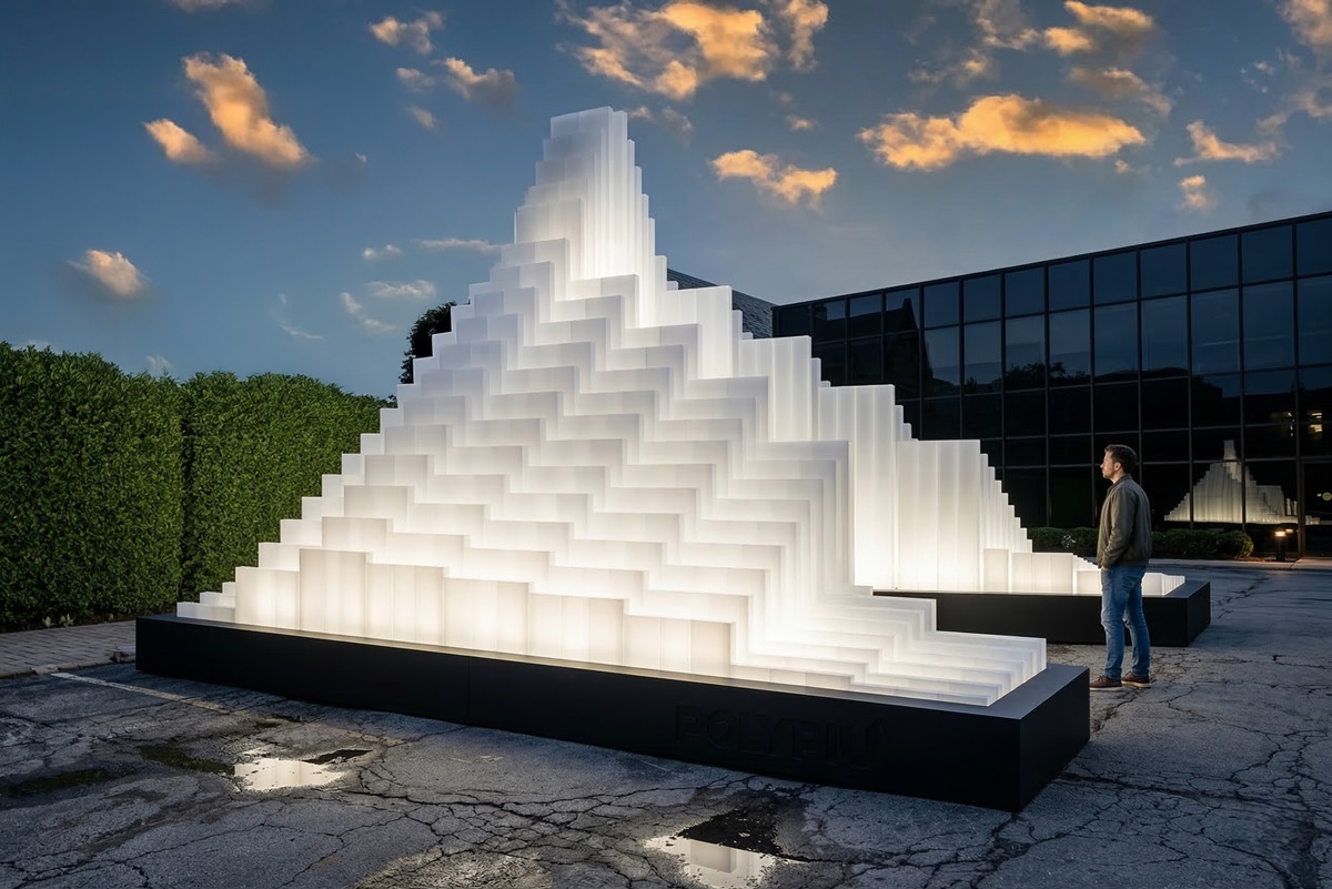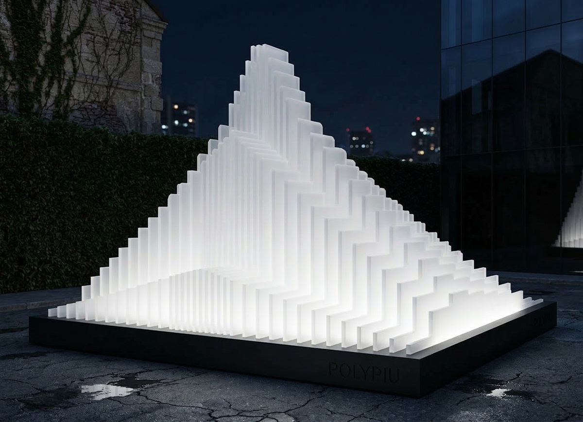 Site-specific è invece Cathedral di PolyPiù, un’opera che trasforma il policarbonato, formata da una struttura a gradoni esaltata dalla luce per definire uno spazio rigoroso, basato sull’equilibrio tra massa traslucida e vuoto fruibile.